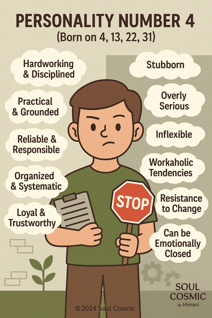 If you are born on the 4th, 13th, 22nd, or 31st of any month, you resonate with the energy of Personality Number 4 — a number known for its strong foundation, discipline, and dedication.