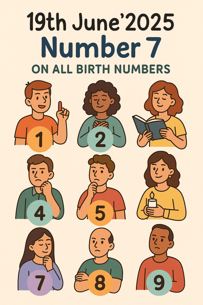 Today is Thursday, 19th June 2025, which adds up to a Universal Day Number 7 (1+9+6+2+0+2+5 = 25 → 2+5 = 7). Number 7 is deeply spiritual, introspective, analytical, and connected to inner wisdom and intuition. Since today is also a Thursday (ruled by Jupiter), the energy becomes a beautiful mix of spirituality + wisdom + introspection.