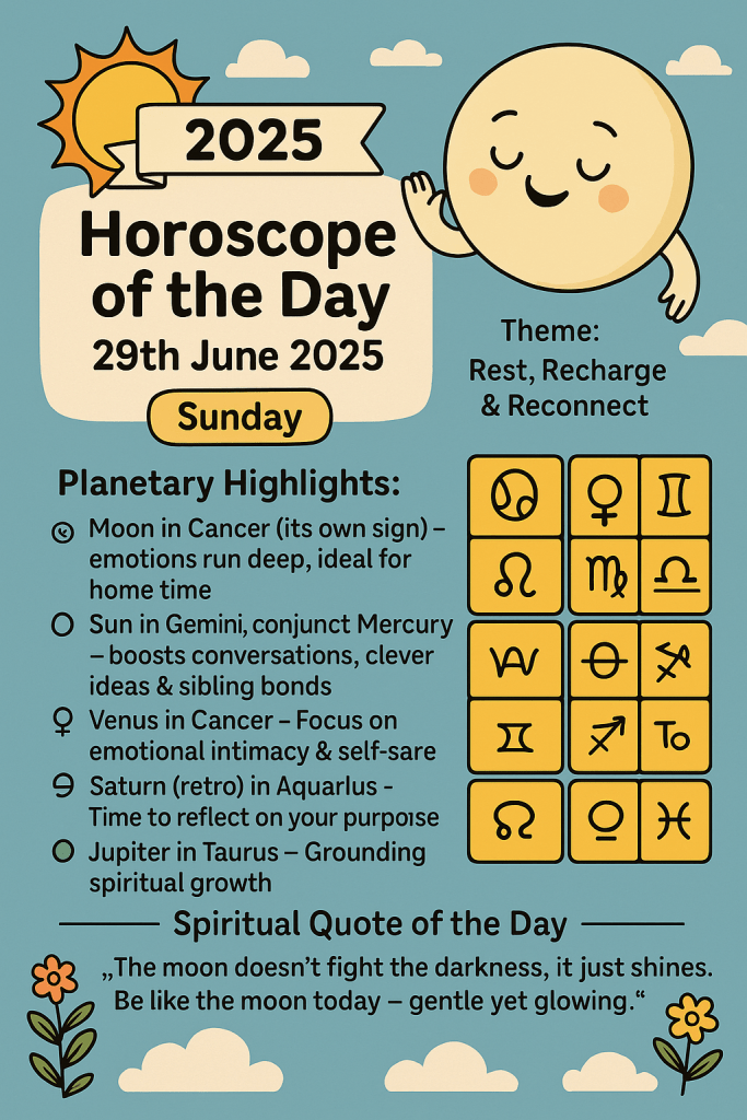 Moon transits through Cancer (its own sign) – emotions run deep, ideal for home time. Sun in Gemini, conjunct Mercury – boosts conversations, clever ideas & sibling bonds. Venus in Cancer – focus on emotional intimacy & self-care. Saturn (retro) in Aquarius – time to reflect on your purpose & connections. Jupiter in Taurus – grounding spiritual growth.