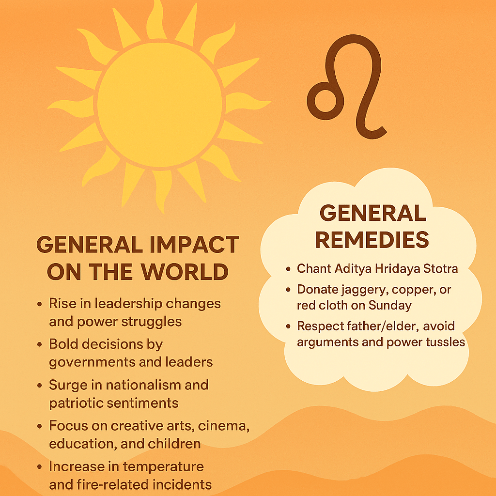 When Sun enters Leo, its Mooltrikona sign, the energy is fiery, confident, and authoritative. Globally, this transit can bring: