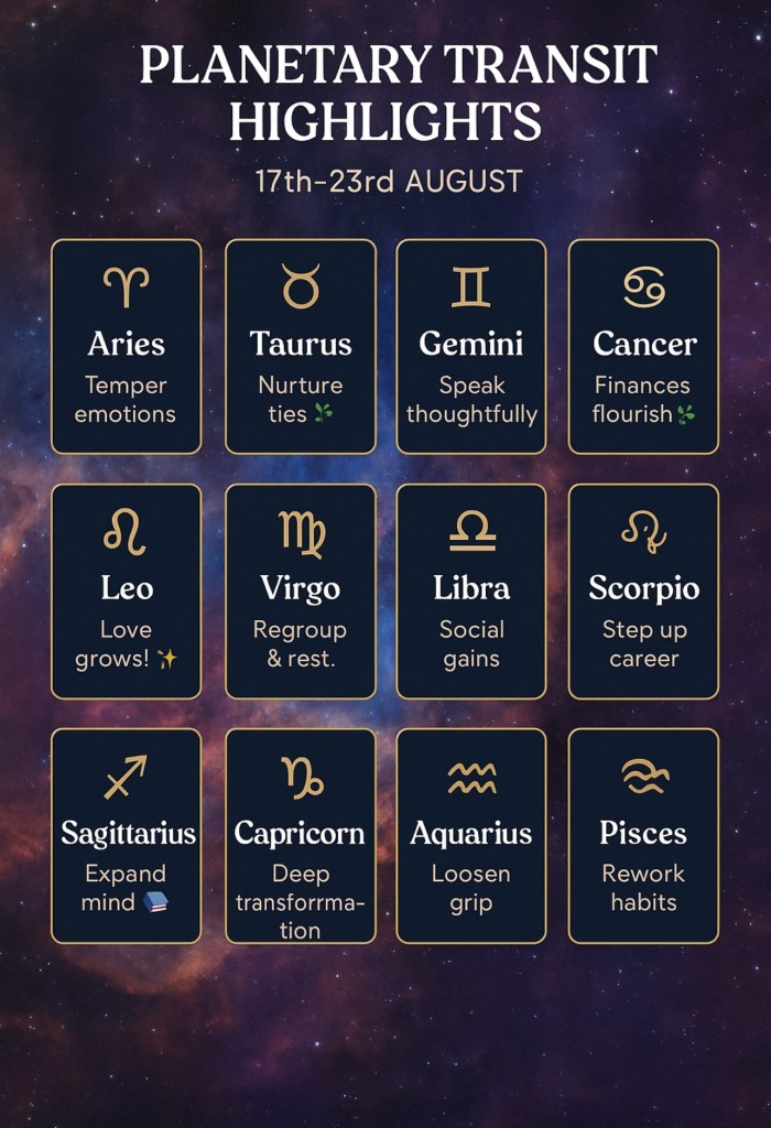 The week begins with the powerful Sun entering its own sign Leo in Magha Nakshatra on 17th August — a call to embrace your inner royalty, step into purpose, and honor ancestral wisdom.