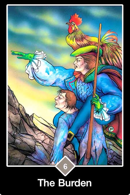 The 6 of Clouds (The Burden) from the Osho Zen Tarot is all about the unnecessary weight we carry — not the gym dumbbells, but those invisible “shoulds” that sit on our shoulders. Society, family, bosses, even our own overthinking minds love to pile them on: