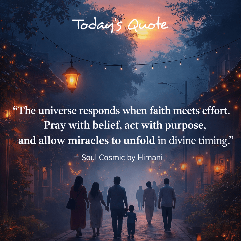 “जब आस्था और प्रयास साथ आते हैं, तभी ब्रह्मांड उत्तर देता है।विश्वास के साथ प्रार्थना करें, उद्देश्य के साथ कर्म करें,और दिव्य समय में चमत्कारों को घटित होने दें।”